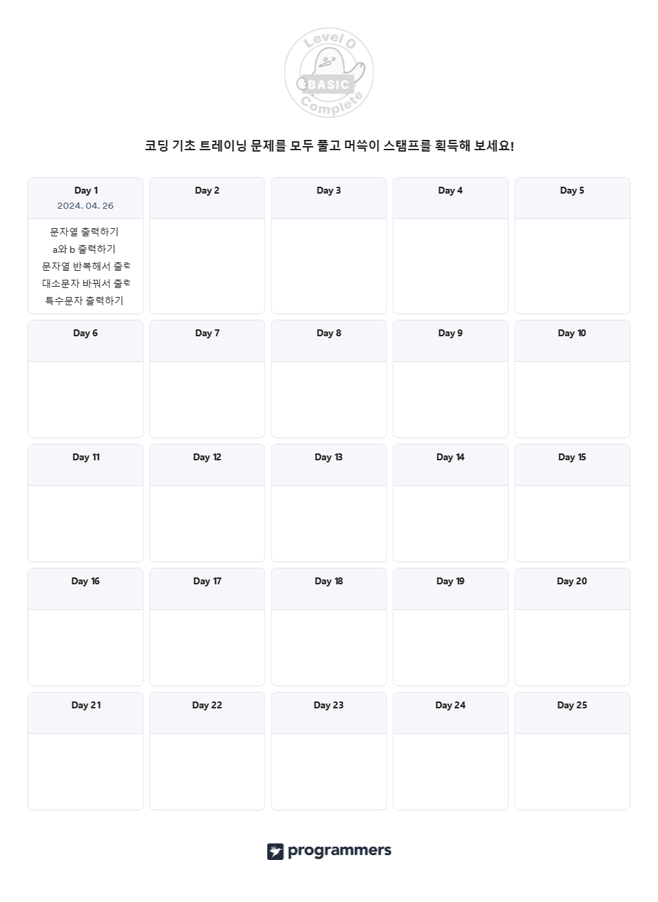 | Java 프로그래머스 코딩 기초 트레이닝 Day 2 출력, 연산 (0) | 2024.04.27 |