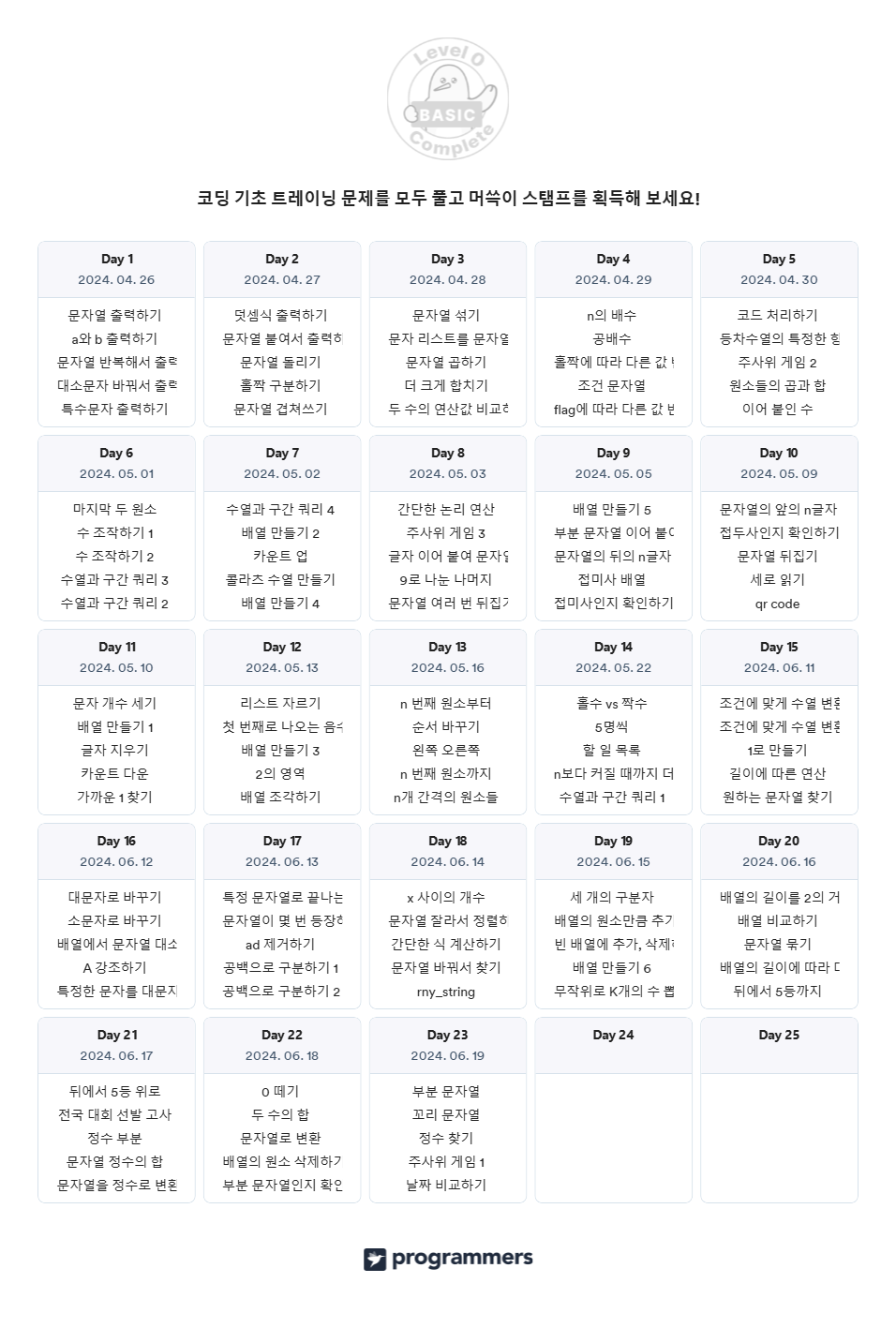 | Java 프로그래머스 코딩 기초 트레이닝 Day 24 조건문 활용, 반복문 활용, 이차원 리스트(배열) (0) | 2024.06.20 |