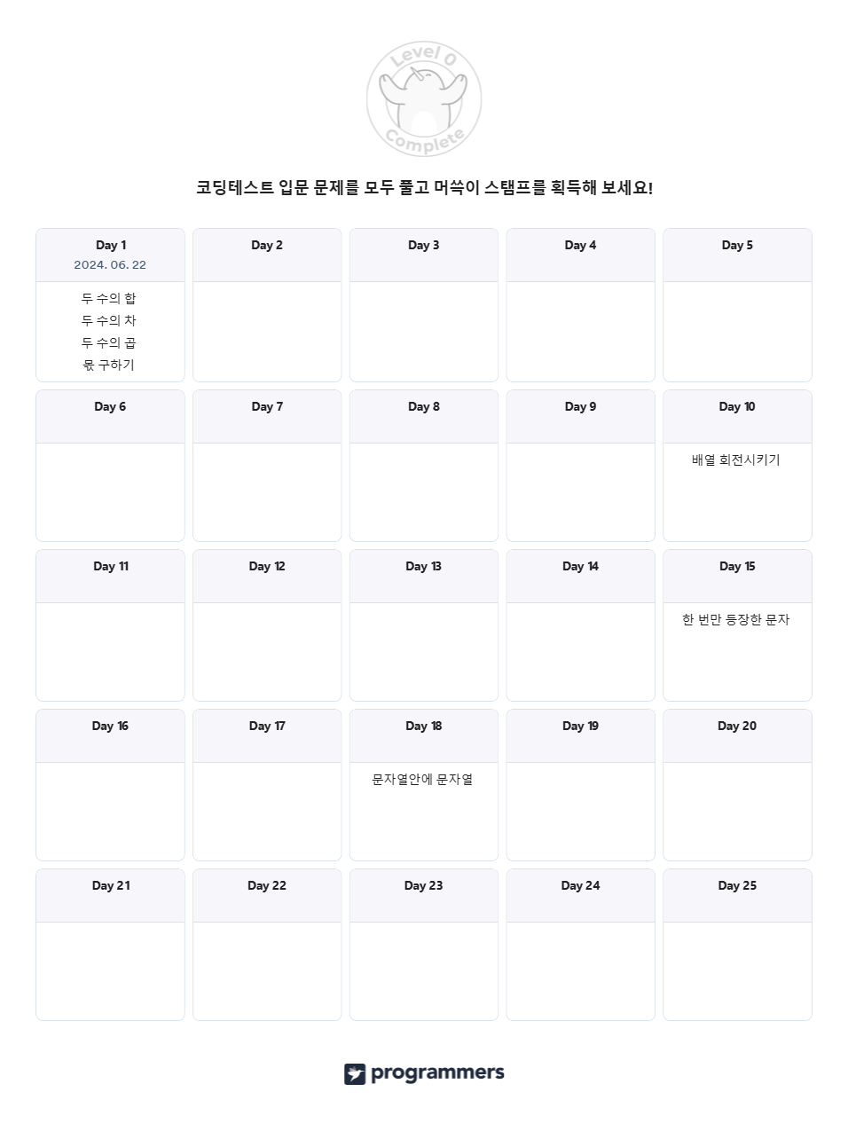 | Java 프로그래머스 코딩테스트 입문 Day 2 사칙연산, 조건문, 배열 (0) | 2024.06.23 |
