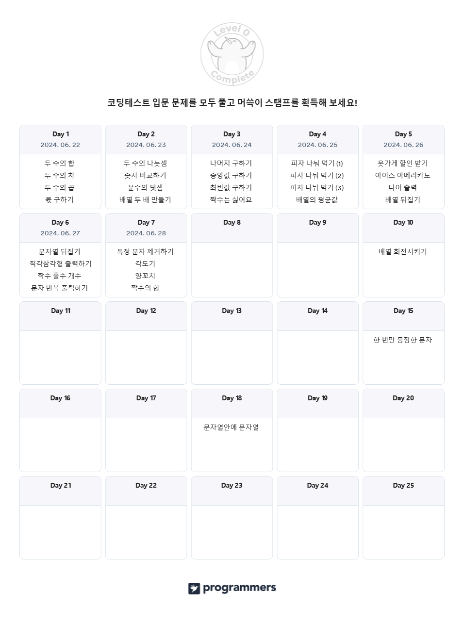 | Java 프로그래머스 코딩테스트 입문 Day 6 문자열, 반복문, 출력, 배열, 조건문 (0) | 2024.06.27 |