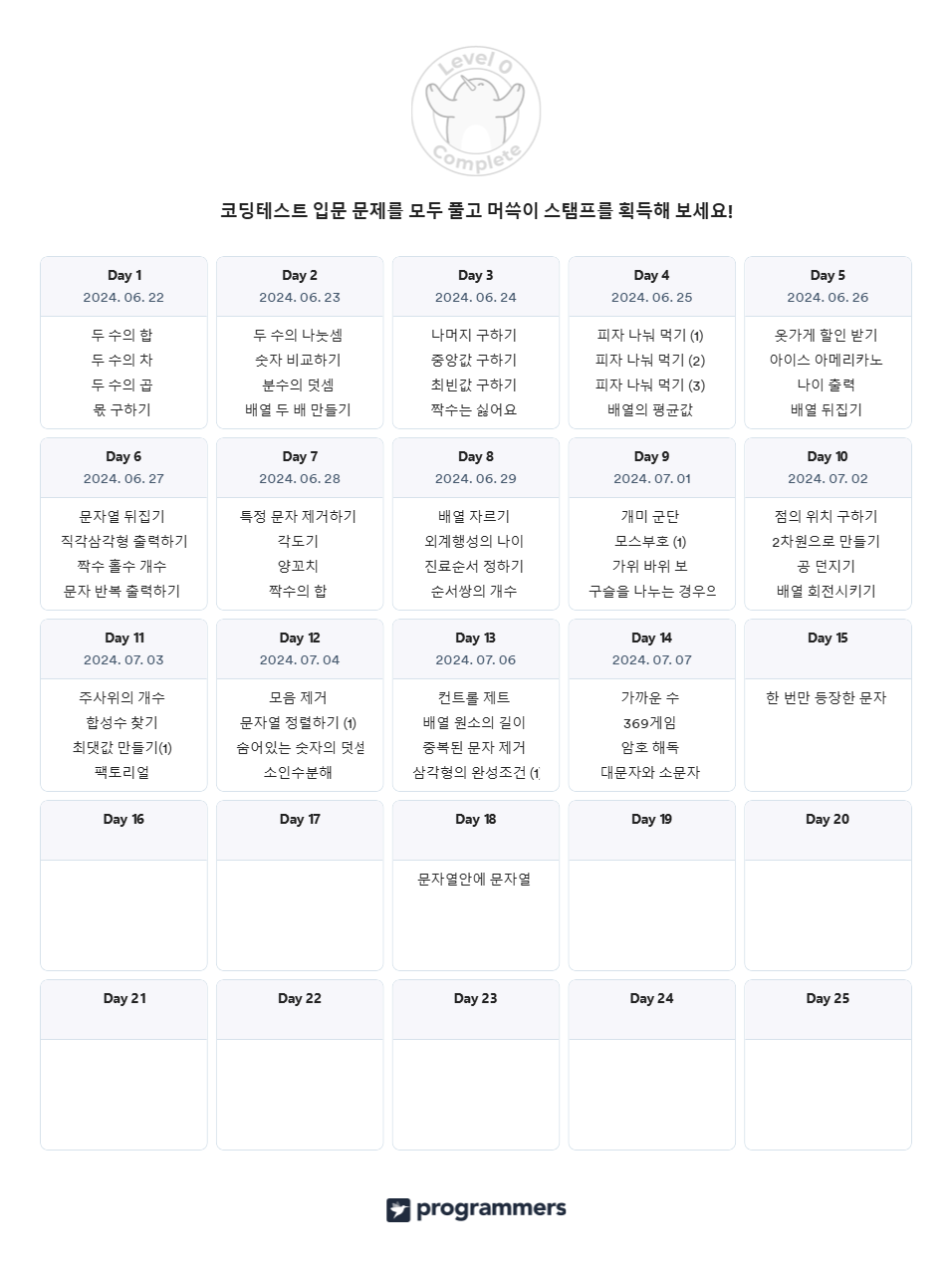 | Java 프로그래머스 코딩테스트 입문 Day 16 문자열, 수학, 배열, 조건문 (0) | 2024.07.09 |