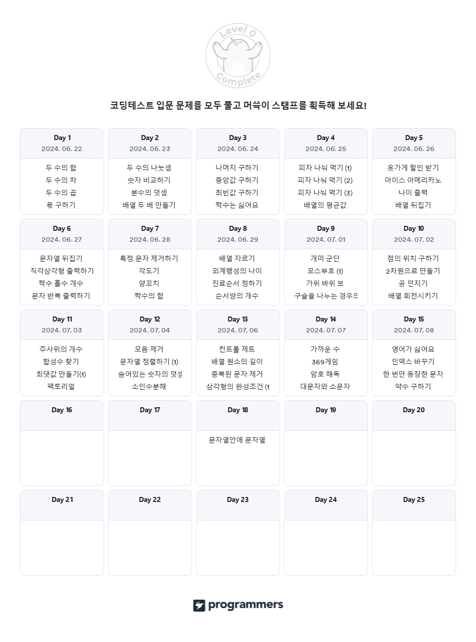 | Java 프로그래머스 코딩테스트 입문 Day 17 문자열, 수학, 조건문, 배열, 사칙연산 (0) | 2024.07.10 |