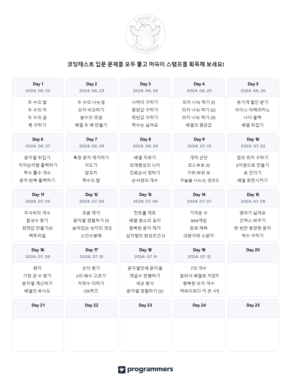 | Java 프로그래머스 코딩테스트 입문 Day 21 문자열, 사칙연산, 시뮬레이션, 2차원배열, 수학, 배열 (2) | 2024.07.15 |