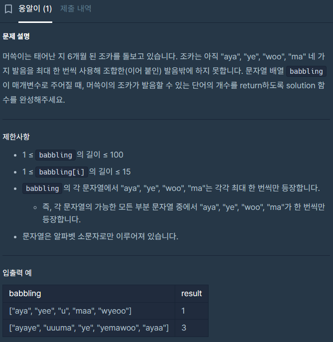 System.out.println(solution(new String[]{"aya", "yee", "u", "maa", "wyeoo"}));