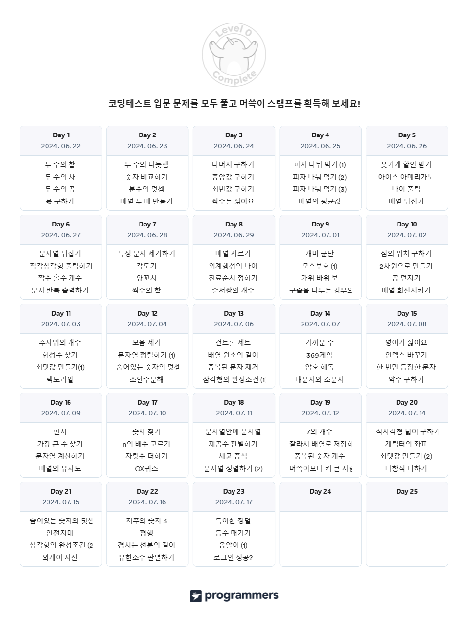 | Java 프로그래머스 코딩테스트 입문 Day 25 시뮬레이션, 조건문, 수학 (0) | 2024.07.19 |